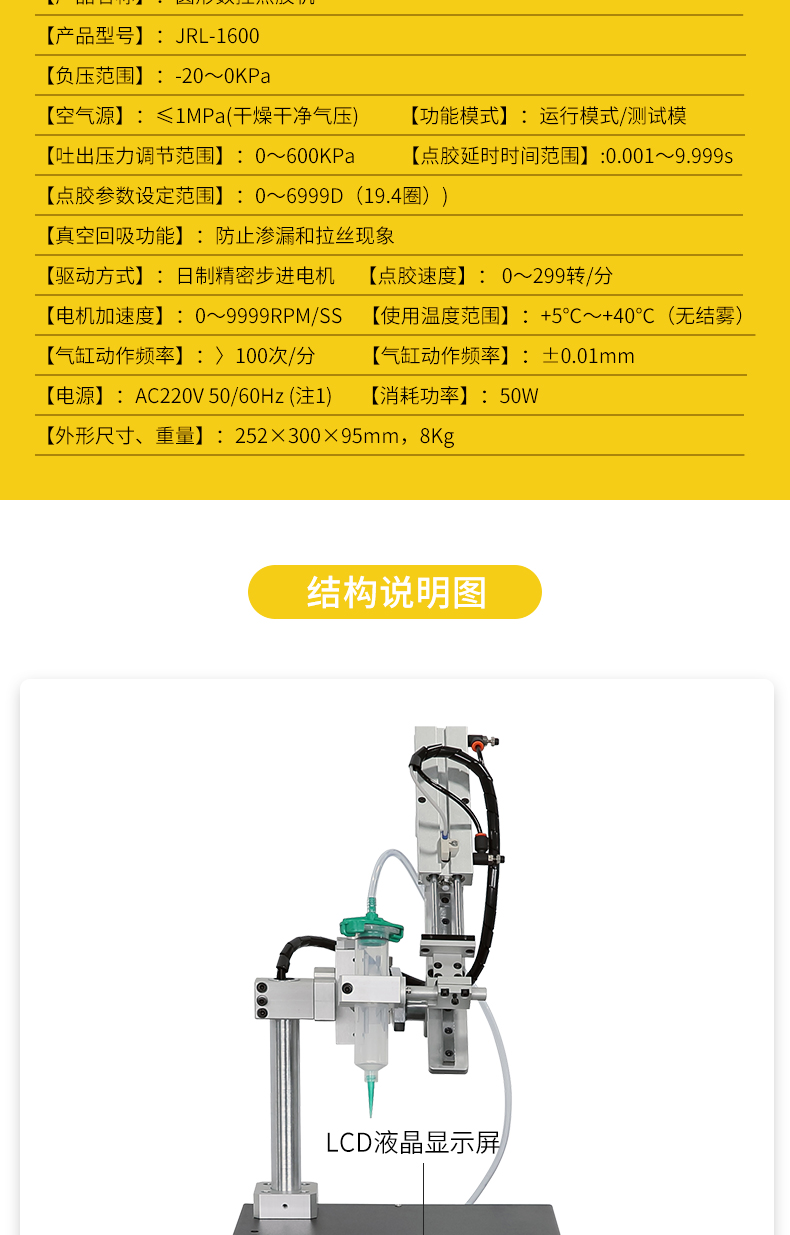 ·LCD液晶顯示設定開始點膠角度、結束點膠角度及點膠圈數、電機的正反轉、電機的運轉速度及加速度,機械重復精度精確到±0.01mm。